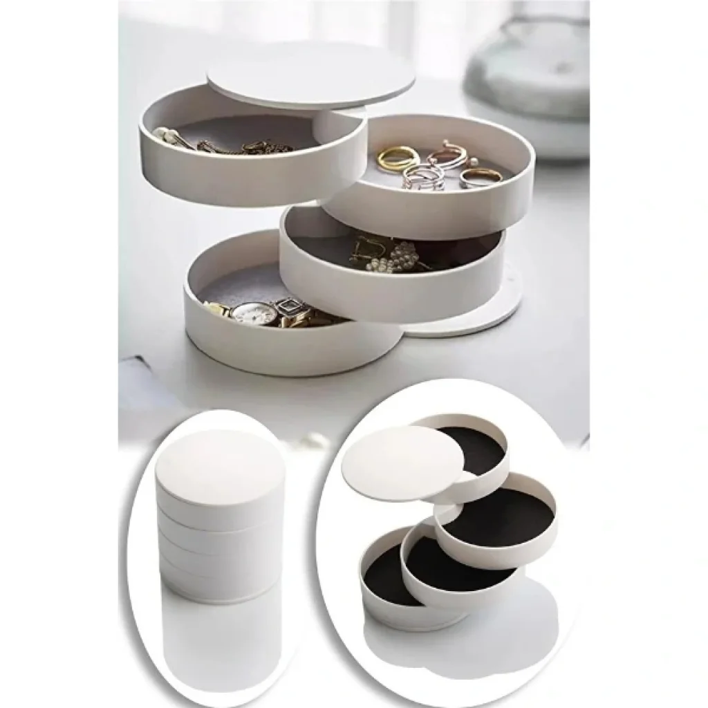 4 KATLI DÖNEN SİLİNDİR TAKI ORGANİZERİÜrün Özellikleri4 katlı dönen silindir takı organizeri, zarif ve pratik tasarımıyla takı ve aksesuarlarınızı düzenli bir şekilde saklamanızı sağlar. 11x11x12 cm boyutunda olan bu organizer, kompakt yapısıyla az yer kaplarken geniş depolama alanı sunar. BPA içermeyen kaliteli plastik malzemeden üretilmiştir, böylece sağlıklı ve güvenli kullanım sağlar. 360° dönebilen katmanları sayesinde yüzük, kolye, bileklik, küpe ve diğer takılarınızı kolayca yerleştirip hızlı bir şekilde erişebilirsiniz. Renk seçeneği bulunmamaktadır, görsellerdeki renklerden karışık olarak gönderilmektedir. Hem şık bir dekoratif obje hem de kullanışlı bir saklama çözümü sunar.Paket İçeriği1 adet 4 Katlı Dönen Silindir Takı Organizeri