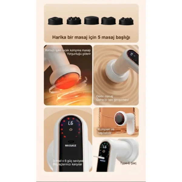 5 BAŞLIKLI TİTREŞİMLİ SIKIŞTIRICI MASAJ MAKİNESİÜrün Özellikleri5 başlıklı titreşimli sıkılaştırıcı masaj makinesi, günlük kas yorgunluğunu azaltmaya ve vücudun farklı bölgelerinde rahatlama hissi sağlamaya yardımcı olacak şekilde tasarlanmıştır. Değiştirilebilir 5 farklı masaj başlığı sayesinde boyun, omuz, sırt, bel, bacak ve kalça gibi bölgelerde hedefli kullanım imkânı sunar. Kırmızı ışık destekli sıcak kompres özelliği, masaj sırasında kasların gevşemesine katkı sağlar ve rahatlama etkisini artırır. Güçlü titreşim motoru, ayarlanabilir hız ve şiddet kademeleri ile kişisel ihtiyaca göre masaj deneyimi sunar. Kompakt ve hafif yapısı sayesinde evde, ofiste veya seyahatlerde kolayca kullanılabilir. Type-C şarj özelliği ile pratik bir kullanım sağlar ve kablo karmaşasını ortadan kaldırır. Ergonomik tutuş yapısı, uzun süreli kullanımlarda bile konforlu bir deneyim sunmayı hedefler. Günlük bakım rutininize destek olacak pratik bir masaj çözümüdür.Paket İçeriği1 adet Titreşimli Masaj Makinesi5 adet Masaj Başlığı1 adet Type-C Şarj Kablosu