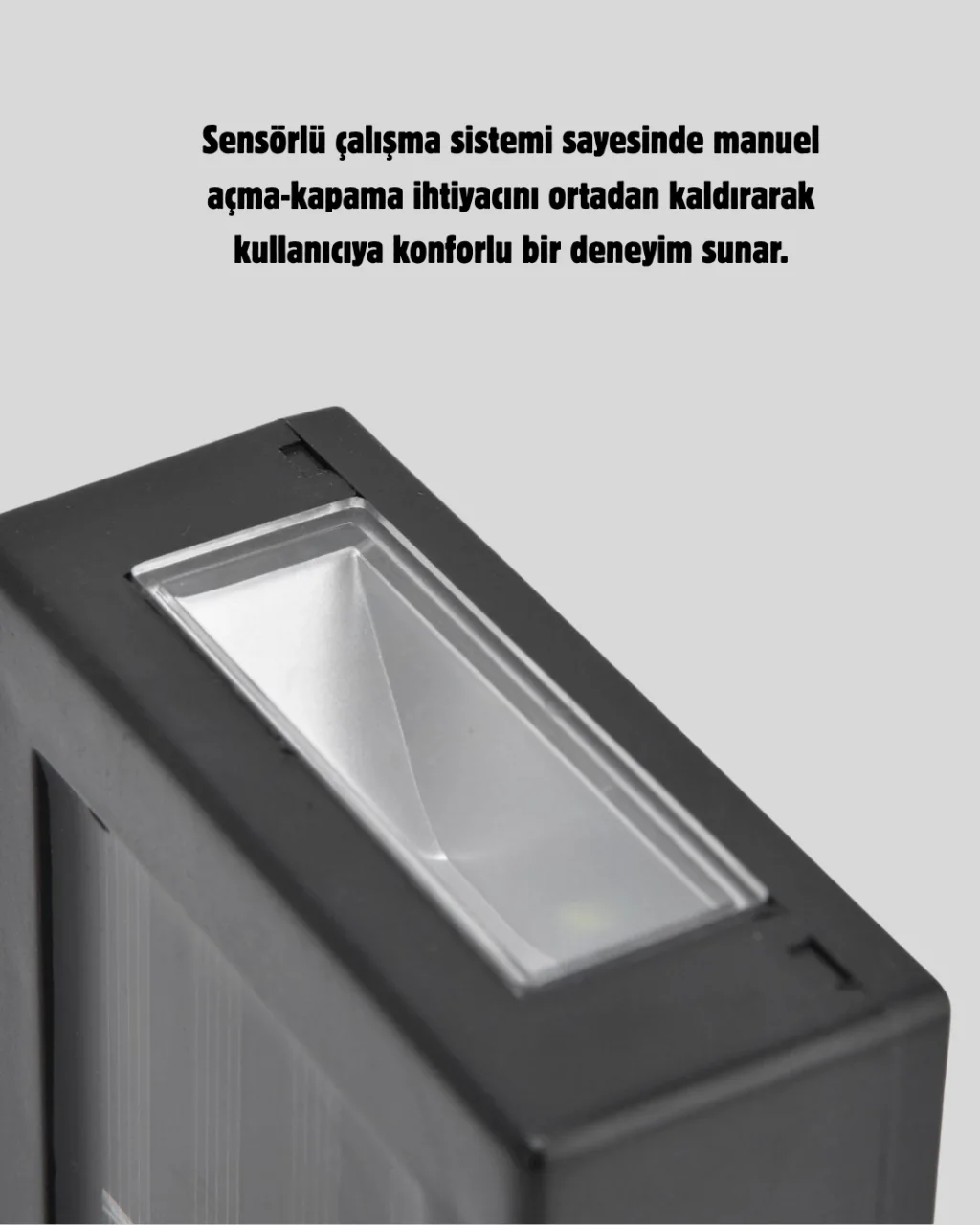 Bu güneş enerjili aydınlatma sistemi, modern teknolojiyi doğayla buluşturur. Dahili ışık sensörü sayesinde tamamen otomatik çalışır: Gün boyunca güneş enerjisini emerek bataryasında depolar, hava karardığında ise kendiliğinden devreye girerek bulunduğu alanı aydınlatır. Gün doğduğunda tekrar kapanır ve şarj döngüsüne devam eder. Bu sistem, enerji tasarrufunu en üst seviyeye çıkarırken, manuel müdahale ihtiyacını ortadan kaldırır. 6 adet yüksek parlaklıklı LED, geniş bir aydınlatma alanı sağlar. Bahçe yolları, teraslar, balkonlar, garaj girişleri veya verandalar için mükemmel bir çözümdür. IP65 su geçirmez gövdesi, yağmur ve dış etkenlere karşı tam koruma sağlar. ABS malzemeden üretilmiş dayanıklı yapısı uzun ömürlü kullanım sunar. Montajı kablosuzdur ve duvara kolayca sabitlenebilir. Bu çevre dostu solar lamba, düşük enerji tüketimiyle hem gezegenimizi hem cebinizi korur.