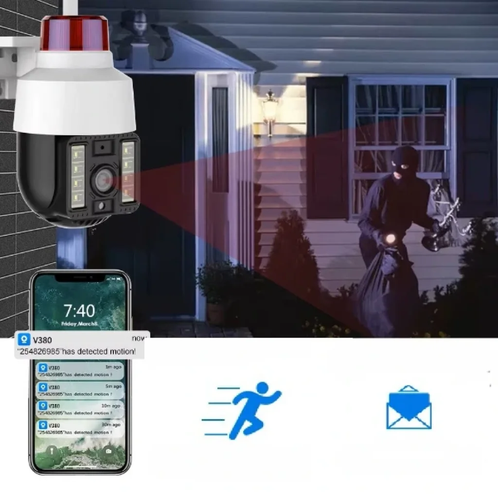 ALARMLI DIŞ MEKAN GÜVENLİK KAMERASIÜrün ÖzellikleriAlarmlı dış mekan güvenlik kamerası, 3MP HD çözünürlük ile net ve detaylı görüntüler sunar. Gece görüş özelliği tam renkli kayıt yapabilme imkânı verirken, hareket algılama fonksiyonu şüpheli durumlarda anında bildirim gönderir. Çift yönlü ses desteği sayesinde hem dinleme hem de konuşma yapılabilir. IP66 su geçirmezlik sertifikası sayesinde yağmur, kar ve güneş altında dayanıklı kullanım sağlar. H.265 sıkıştırma teknolojisi ile daha düşük veri kullanımı ve yüksek kalite bir arada sunulur. TF kart ve bulut depolama desteği ile kayıtlar güvenle saklanabilir.Alarm özelliği ile istenmeyen hareketlerde sesli uyarı vererek caydırıcı bir güvenlik sağlar. ONVIF / NVR uyumluluğu sayesinde farklı güvenlik sistemleri ile entegre edilebilir.Paket İçeriği1 adet Alarmlı Dış Mekan Güvenlik Kamerası