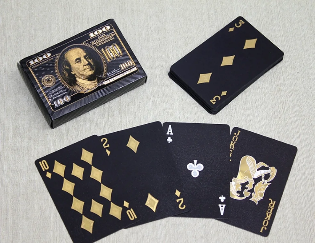 ALTIN DOLAR TASARIMLI SİYAH İSKAMBİL OYUN KARTIÜrün ÖzellikleriAltın dolar tasarımlı siyah iskambil oyun kartı, lüks görünümü ve özel tasarımıyla oyun keyfinizi daha şık hale getirir. 9x6 cm boyutunda üretilen bu deste, siyah zemin üzerine altın detaylarla hazırlanmış göz alıcı bir tasarıma sahiptir. Dayanıklı yapısı sayesinde uzun süre kullanım imkânı sunar. Hem oyun oynamak hem de koleksiyon ya da dekoratif amaçlarla tercih edilebilecek özel bir üründür. Şık kutu tasarımı ile hediye olarak da mükemmel bir seçenektir.Paket İçeriği1 adet Altın Dolar Tasarımlı Siyah İskambil Oyun Kartı Destesi