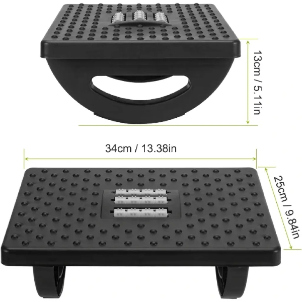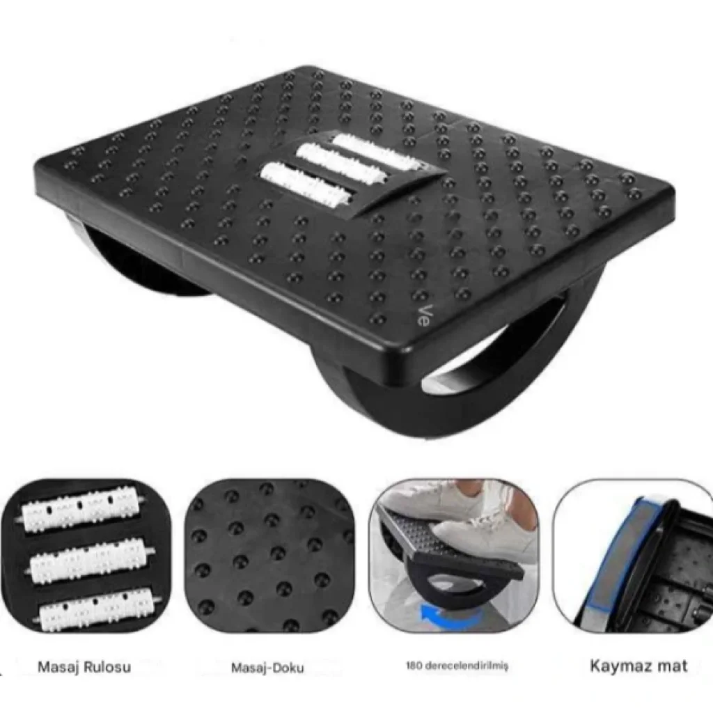 AYAK DESTEK VE MASAJ ALETİÜrün ÖzellikleriAyak destek ve masaj aleti, masa başında çalışanlar için ergonomik rahatlık sunarken ayak sağlığını destekleyen özel bir tasarıma sahiptir. 34 cm x 25 cm ölçülerindeki bu ürün, 13 cm yüksekliğe sahiptir ve alt kısmında yer alan bombeli denge yapısı sayesinde ayak hareketlerini doğal şekilde destekler. Yüzeyindeki çıkıntılı masaj dokusu ve ortasında bulunan 3 adet masaj rulosu ile ayak tabanına baskı uygulayarak kan dolaşımını artırır. Kaymaz mat yüzeyi sayesinde güvenli bir kullanım sunar. 180 derece eğim kabiliyetiyle ayakların konumunu rahatça ayarlayabilir. Hem evde hem ofiste kullanılmak üzere ideal ve taşınabilir bir çözümdür.Paket İçeriği1 Adet Ayak Destek ve Masaj Aleti
