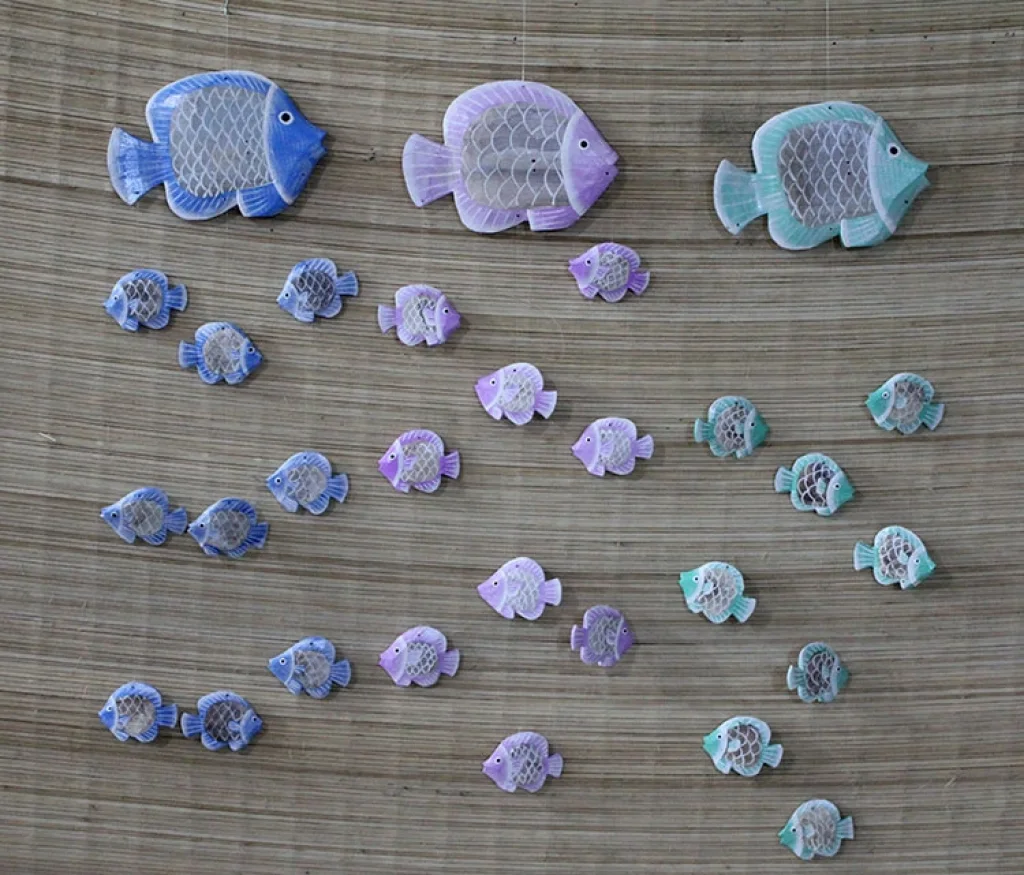 BALIKLI ASMALI RÜZGAR ÇANI Ürün ÖzellikleriBalıklı Asmalı Rüzgar Çanı, balık figürleri ile tasarlanmış, doğal ahşap malzeme kullanılarak üretilmiştir. Balık figürleri, deniz temalı dekorlara şıklık katarak, mekânınıza huzur veren bir atmosfer sunar. Asmalı tasarım sayesinde pratik bir şekilde her türlü alanda kullanılabilir ve rüzgarla hareket ettiğinde melodik bir ses çıkarır. Bahçe, balkon veya iç mekanlar için mükemmel bir dekoratif üründür. Ahşabın doğal dokusu ve balık figürleri, mekânınıza doğal ve canlı bir hava katarken, estetik ve fonksiyonellik sunar. Hem dekoratif hem de fonksiyonel olarak kullanılabilen bu ürün, ayrıca hediye olarak da harika bir tercihtir.Paket İçeriği1 adet Balıklı Asmalı Rüzgar Çanı