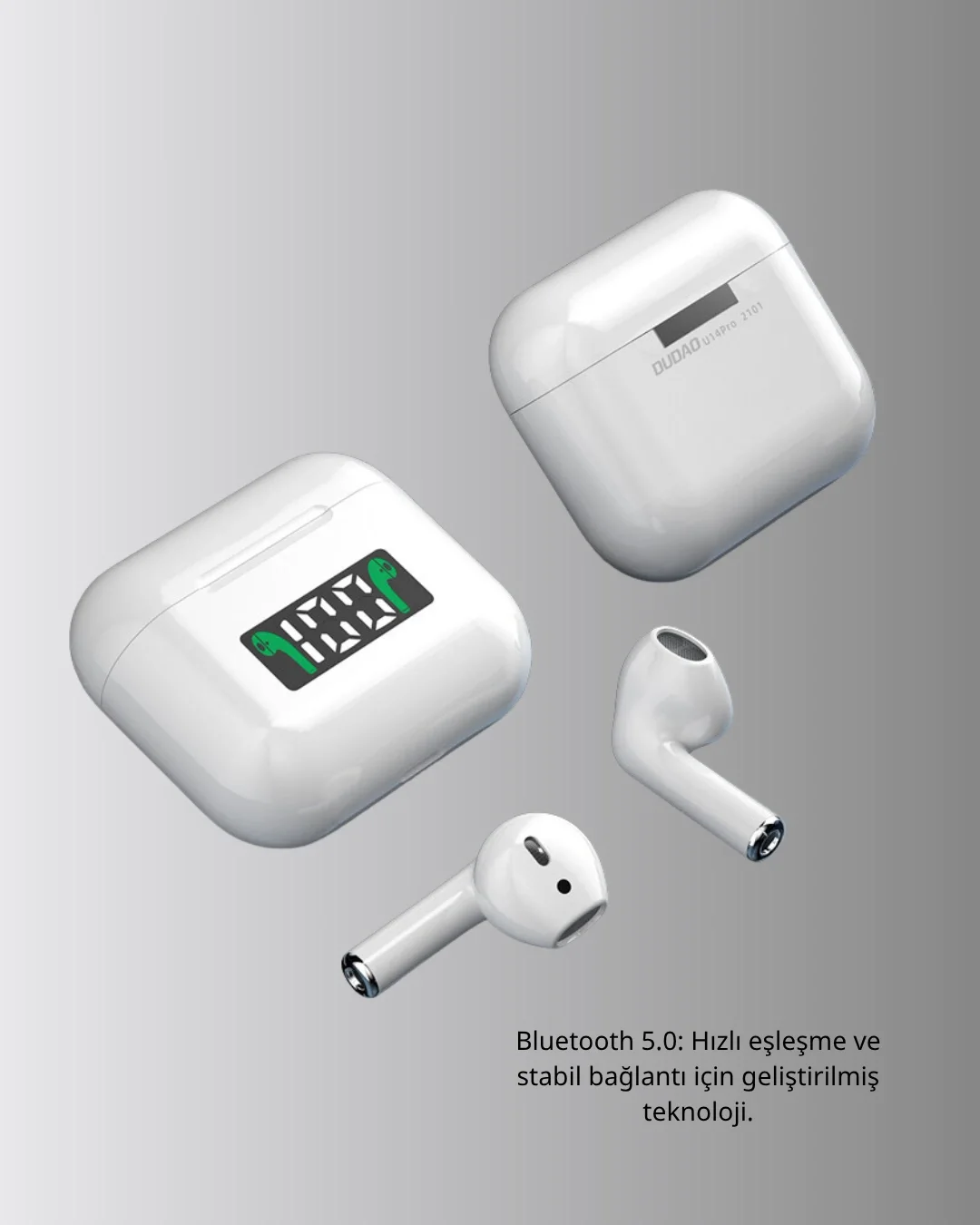 Yüksek performans ve konforu bir araya getiren bu TWS Bluetooth kulaklık, kablosuz teknolojinin en gelişmiş versiyonu olan Bluetooth 5.0 ile donatılmıştır. Bu sayede cihazlar arasında hızlı bağlantı kurar ve veri aktarımını kesintisiz hale getirir. Android ve iOS işletim sistemli tüm akıllı telefonlar, tabletler ve bilgisayarlarla kolayca uyum sağlar.Dokunmatik kontrol paneli sayesinde fiziksel tuşlara ihtiyaç duymadan çağrıları yanıtlayabilir, müzik duraklatabilir veya şarkılar arasında geçiş yapabilirsiniz. LED göstergesi, hem kulaklık hem de şarj kutusunun pil seviyesini kolayca takip etmenizi sağlar.Ergonomik kulak içi tasarımı, uzun süreli kullanımda konfor sunar. Ter ve suya karşı dayanıklı yapısı sayesinde spor yaparken, yağmurlu havalarda ya da dış mekânda rahatlıkla kullanılabilir.Yüksek çözünürlüklü ses çıkışı, derin baslar ve net tizlerle müzik deneyimini bir üst seviyeye taşır.Kompakt şarj kutusu sayesinde kulaklıklarınızı her yerde yanınızda taşıyabilir, gün boyu müziğinizin keyfini çıkarabilirsiniz.Modern görünümü, kaliteli malzeme yapısı ve pratik kullanımıyla bu kulaklık hem performans hem estetik açısından mükemmel bir tercihtir.