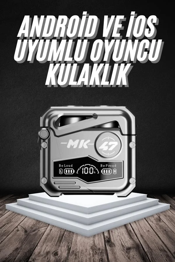 Gerçek Kablosuz ÖzgürlükMK47 Bluetooth kulaklık, dokunmatik kontrol özelliği ile kullanımı son derece kolay hale getirir. Cep telefonu oyuncuları için özel olarak optimize edilen bu kulaklık, ultra düşük gecikme süresiyle oyun deneyiminizi zirveye taşır. Kulaklıkları şarj kutusundan çıkardığınız anda otomatik olarak telefonunuzla eşleşir, böylece hiçbir anı kaçırmazsınız.Kristal Netliğinde 3D Ses ve Aktif Gürültü EngellemeTaşınabilir medya oynatıcı, mobil cihaz veya oyun konsolu ile uyumlu olan MK47, güçlü 3D ses teknolojisiyle sizi oyunun ya da müziğin tam ortasına taşır. Aktif gürültü iptali özelliği sayesinde dış ortam seslerini izole eder. Farklı boyutlarda sunulan kulak tıkaçları sayesinde kulaklığınız sabit kalır ve konforlu bir kullanım sunar – ister spor yapın ister günlük yürüyüşlerinizde kullanın.Güçlü Pil Performansı ve IPX5 Su DirenciKulaklıklar tek bir şarjla 4-5 saat kesintisiz kullanım sunar. 400mAh kapasiteli şarj kutusu ise kulaklıklarınızı birkaç kez yeniden şarj edebilir. Type-C şarj portu sayesinde hızlı ve pratik şekilde şarj olur. IPX5 su geçirmezlik derecesi ile yağmura ve tere karşı dayanıklıdır – dış mekan kullanımı için ideal bir seçenektir.