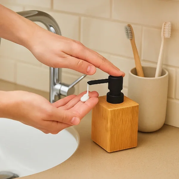 BÜYÜK AHŞAP SIVI SABUNLUKÜrün ÖzellikleriBüyük Ahşap Sıvı Sabunluk, doğal bambu ahşap tasarımı ile banyonuza veya mutfağınıza estetik ve modern bir dokunuş katar. 100 ml hacmiyle günlük kullanım için pratik bir çözüm sunar. Dayanıklı yapısı sayesinde uzun ömürlüdür ve paslanmaz pompa sistemi ile hijyenik bir kullanım sağlar. Minimalist tasarımı, her dekorasyon tarzına uyum sağlayarak yaşam alanlarınıza şıklık katar.Ahşap gövdesi sayesinde çevre dostu bir üründür. Pompaj mekanizması sıvı sabun, bulaşık deterjanı veya dezenfektan için kullanılabilir. Kompakt boyutu sayesinde lavabo kenarında fazla yer kaplamaz, şık ve düzenli bir görünüm oluşturur. Kullanımı kolay olan bu sabunluk, hem ev hem de ofis ortamları için ideal bir üründür.Paket İçeriği1 adet Büyük Ahşap Sıvı Sabunluk