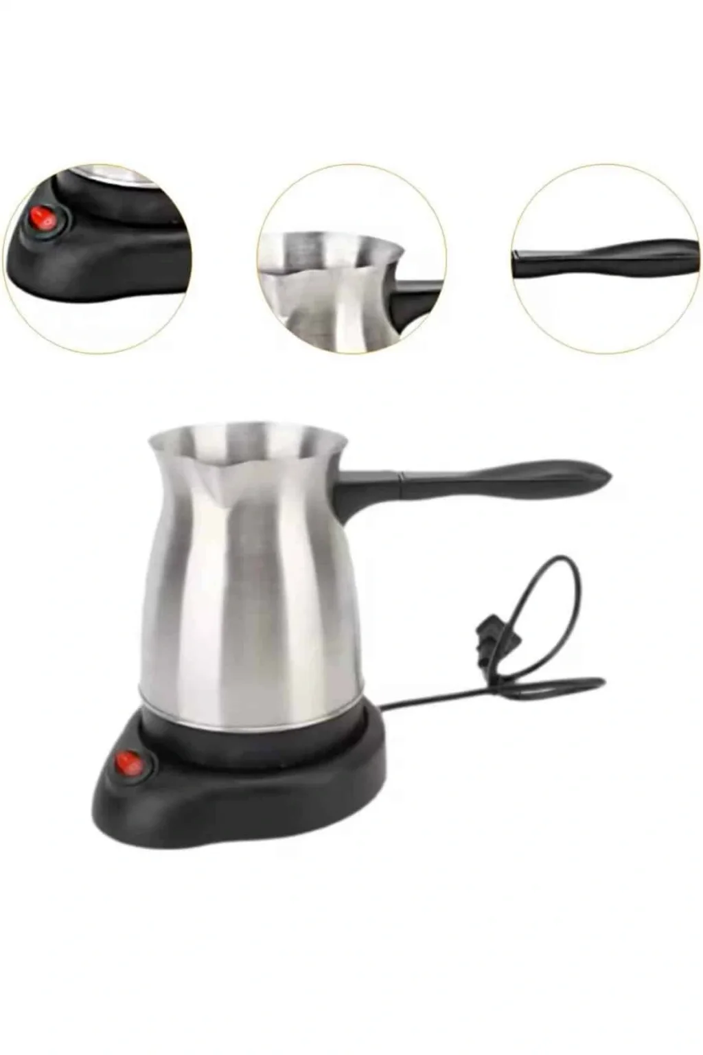 Yüksek performansı ve pratik özellikleriyle öne çıkan bu elektrikli cezve, 800 watt gücü sayesinde mükemmel Türk kahvesi pişirir. 300 ml kapasitesiyle 6 fincana kadar kahve hazırlayabilirsiniz, böylece misafirlerinize ya da kendinize hızlıca lezzetli bir kahve sunabilirsiniz. Gizli rezistans teknolojisi, güvenli ve verimli bir ısıtma sağlar, aynı zamanda temizlik açısından büyük kolaylık sunar.360 derece dönebilir kablosuz tabanı, kullanım sırasında esneklik ve rahatlık sağlar. Bu özellik, cezvenin mutfakta her açıdan rahatça kullanılabilmesini mümkün kılar. Paslanmaz çelikten üretilmiş gövdesi, uzun ömürlü ve dayanıklı olmasının yanı sıra şık bir görünüm sunar. Kolayca temizlenebilen yapısı, hijyenik kullanım olanağı tanır ve kahve hazırlarken temizlik derdini ortadan kaldırır.Cezvenin üzerinde yer alan kırmızı güç düğmesi, açma ve kapama işlemlerini kolaylaştırır. Ergonomik, ısınmayan kulpu ise güvenli bir kullanım deneyimi sağlar. Paslanmaz çelik yapısı, hem dayanıklılığı hem de modern görünümüyle mutfağınıza zarif bir dokunuş katar.Bu elektrikli cezve, Türk kahvesi severler için mükemmel bir seçenek olup, hem lezzetli kahveler hazırlamanızı hem de mutfakta şıklık yaratmanızı sağlar. Hem fonksiyonel hem de estetik açıdan kullanışlı bir cihazdır.
