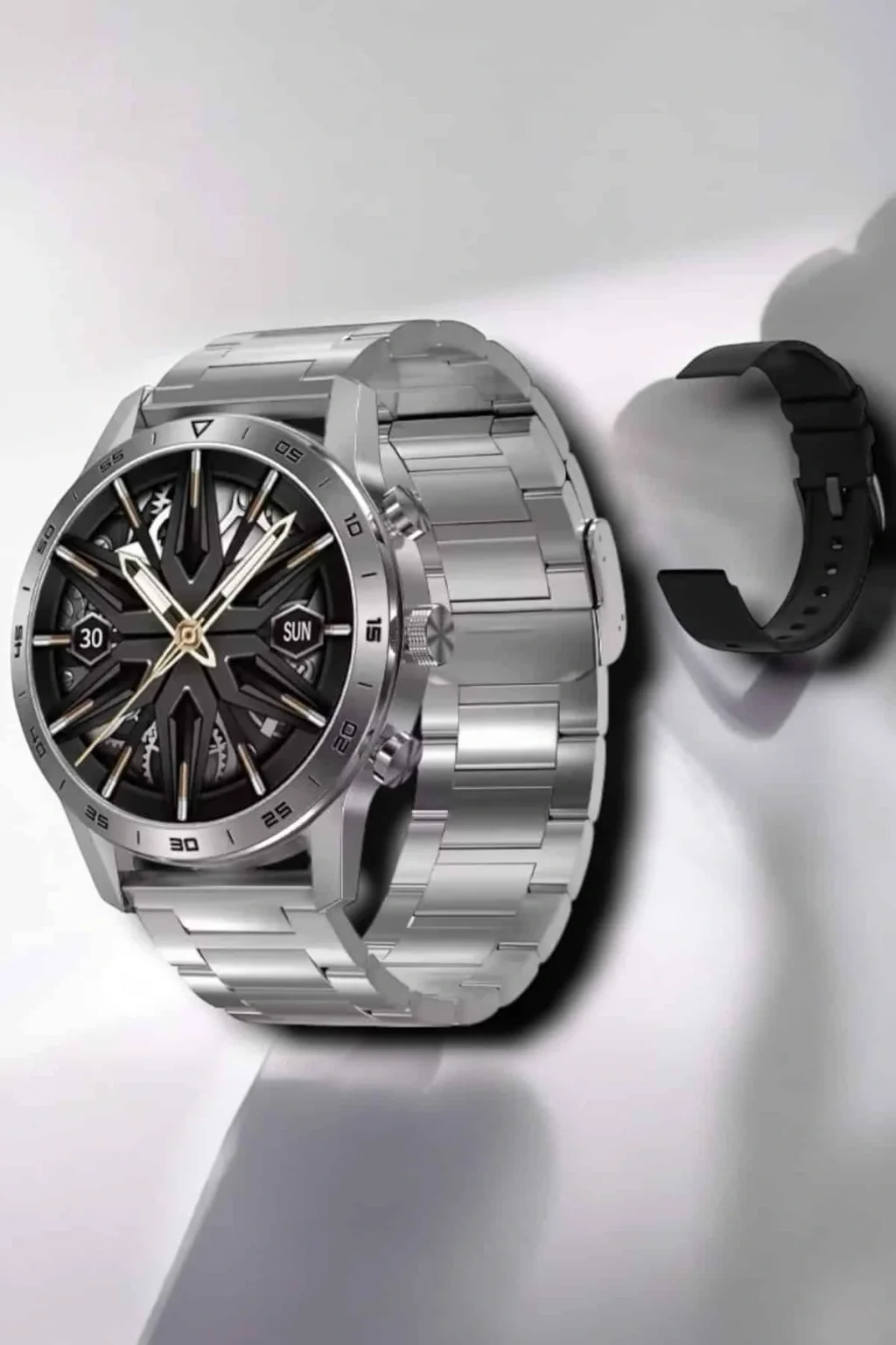 Akıllı Saatte Sağlık, Spor ve Konfor Bir Arada!Yeni nesil akıllı saat, gelişmiş özellikleriyle günlük yaşamınıza değer katar:• Bluetooth 5.0 & Sesli Asistan: Hızlı ve güvenilir bağlantı ile aramalarınızı yönetin, bildirimlerinizi kontrol edin ve sesli asistanla işlemlerinizi kolaylaştırın.• Sağlık Yönetimi: EKG, tansiyon, nabız ölçümü, vücut sıcaklığı kontrolü ve uyku takibi ile sağlığınızı her an izleyin.• Spor Modları ve Kalori Takibi: Farklı spor modları ile antrenmanlarınızı optimize edin ve harcadığınız kaloriyi takip edin.• Suya Dayanıklı ve NFC Desteği: Suya dayanıklılığıyla her ortamda kullanabilir, NFC özelliği ile temassız ödeme yapabilirsiniz.• Yüksek Çözünürlüklü Dokunmatik Ekran: Büyük ve net ekranıyla tüm detaylara hakim olun.• Kablosuz Şarj: Pratik kullanım için kablosuz şarj imkanı sunar.• Şık Çift Kordon Tasarımı: Farklı stiller için iki farklı kordon seçeneği sunar.Bu akıllı saat, iOS ve Android uyumluluğuyla tüm cihazlarınızla sorunsuz bir şekilde çalışır. Hem günlük hayatınızda hem de spor aktivitelerinizde vazgeçilmez bir teknoloji ürünü!