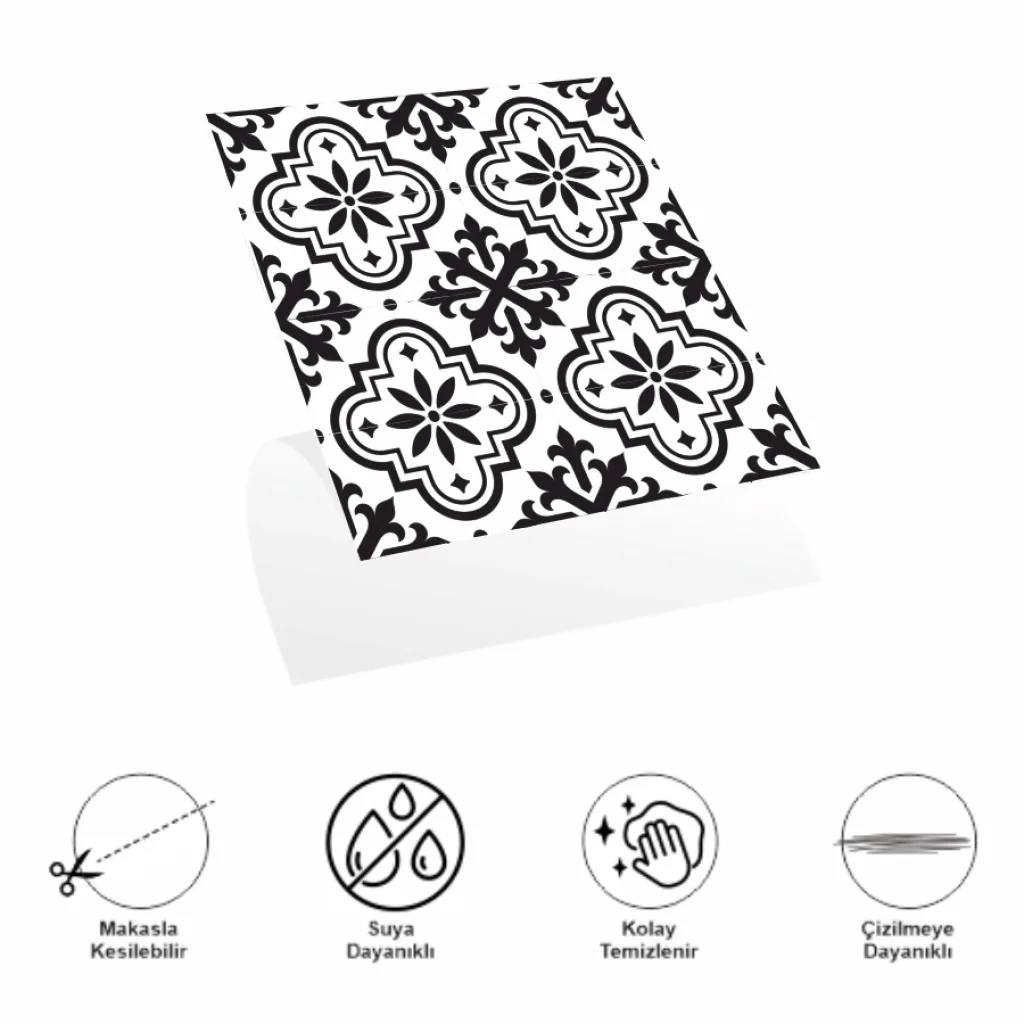 DecoHandy Pvc Duvar Karosu 30x30cm 4'lü Paket - Siyah Beyaz Çini Desen 0,36m2