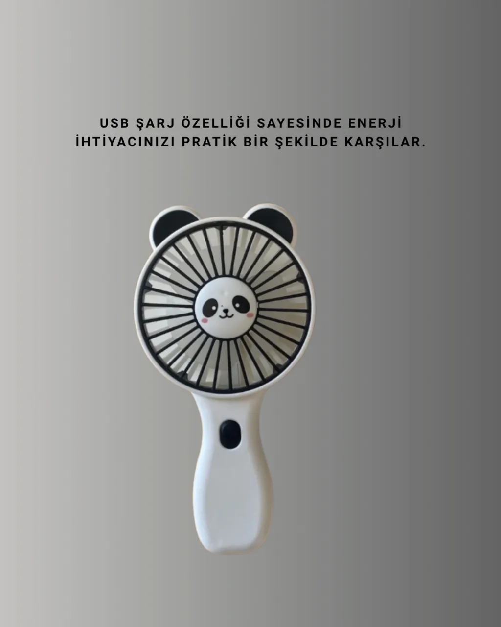 Şık ve sevimli panda temasıyla tasarlanmış bu mini vantilatör, sadece serinletici değil aynı zamanda dekoratif bir aksesuardır. Kompakt tasarımı sayesinde her yere kolayca taşınabilir. Hafif gövdesi, uzun süreli elde kullanımda bile rahatsızlık vermez.USB şarj özelliği sayesinde prize ihtiyaç duymadan, powerbank veya bilgisayar gibi cihazlardan kolayca enerji alabilir. Böylece hem iç hem dış mekân kullanımında kesintisiz bir serinlik deneyimi sunar. Yaz aylarında açık hava etkinlikleri sırasında güvenilir bir yardımcı olur.Yüksek performanslı motor yapısı, hızlı dönen pervanelerle etkili bir soğutma sağlar. Düşük ses seviyesi ile çalıştığı için sessiz ortamlarda bile kullanılabilir. Ofiste, kütüphane ortamında veya evde rahatsızlık vermeden çalışır.Ürünün tek tuşla çalıştırılması, kullanımı son derece kolay hale getirir. Özellikle küçük çocuklar ya da yaşlılar için de rahatlıkla kullanılabilir. Dayanıklı plastik yapısı sayesinde uzun ömürlü bir kullanım sunar. Estetik ve işlevsellik bu üründe bir arada.