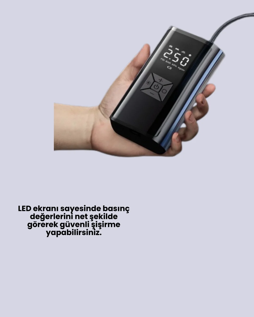 Çok işlevli taşınabilir hava kompresörü, sürücüler için güvenlik ve konforu artıran bir üründür. 80W motor gücü ile arabalar, motosikletler, bisikletler ve spor topları için güçlü performans sunar.Dijital ekranı sayesinde basınç değerlerini hassas bir şekilde görüntüleyebilirsiniz. Kablosuz şişirme teknolojisi, hızlı ve pratik bir kullanım imkanı sağlar. Kompakt boyutu sayesinde kolayca taşınır ve aracınızda az yer kaplar.LED aydınlatma özelliği gece sürüşlerinde veya düşük ışıkta rahat kullanım sunarken, SOS ışıkları acil durumlarda güvenliğinizi artırır. Naylon örgü güçlendirilmiş gövdesi, kırılmaya karşı dayanıklı ve uzun ömürlüdür.Şişme yatak, deniz ürünleri ve spor topları gibi farklı ürünleri de şişirebilme imkanı sunan bu cihaz, seyahatlerde ve günlük yaşamda işinizi kolaylaştırır. Dayanıklı yapısı, güçlü motoru ve kullanıcı dostu arayüzüyle araç sahipleri için vazgeçilmez bir yardımcıdır.