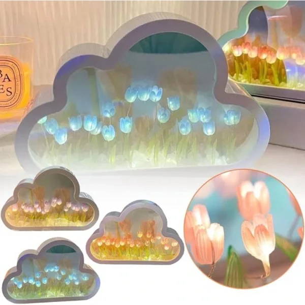 EL YAPIMI BÜYÜK BOY BULUT GECE LAMBASIÜrün ÖzellikleriBu pembe lale gece lambası, odanızı daha konforlu hale getiren sevimli bir dekorasyondur. Bulut aynalı lale lambası, hem masaüstü dekorasyonu hem de küçük bir ayna olarak kullanılabilir. Her çiçek istediğiniz konuma ayarlanabilir ve iki adet AA pil ile çalışır (piller dahil değildir).Ürün ÖlçüleriGenişlik: 20 cmUzunluk: 13 cmPaket İçeriği1 adet El Yapımı Büyük Boy Bulut Gece Lambası