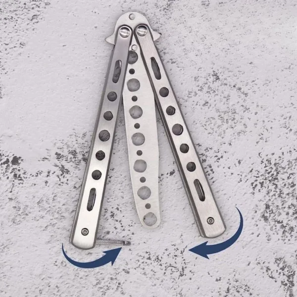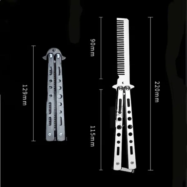 GRİ KATLANABİLİR PASLANMAZ ÇELİK KELEBEK BIÇAK TASARIMLI TARAKÜrün ÖzellikleriGri katlanabilir paslanmaz çelik kelebek bıçak tasarımlı tarak, güvenli ve pratik kullanım sunan özel tasarımıyla saç, sakal ve bıyık şekillendirme işlemlerini kolaylaştırır. Paslanmaz çelik gövdesi uzun ömürlü ve dayanıklı bir yapı sağlarken, kelebek bıçak formundaki katlanabilir mekanizması sayesinde hem estetik hem de taşıması kolay bir kullanım sunar. Ergonomik ve hafif yapısı rahat tutuş imkânı verir, profesyonel ve günlük bakım rutinlerinde konforlu bir deneyim sağlar. Şık gri rengi modern görünümü tamamlar ve tarzınıza uyum sağlar. Güvenli uç yapısı ile balisong tarzını sevenler için risksiz bir alternatiftir; berberler, bakım meraklıları ve seyahatlerde pratiklik arayanlar için idealdir.Paket İçeriği1 adet gri katlanabilir paslanmaz çelik kelebek bıçak tasarımlı tarak