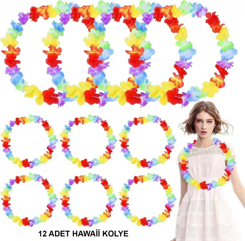 HAWAII ÇİÇEKLİ BOYUN KOLYESİ 12 ADETÜrün ÖzellikleriHawaii Çiçekli Boyun Kolyesi, tropikal temalı etkinlikler için mükemmel bir aksesuardır. Set, 12 adet renkli çiçekli boyun kolyesi içerir. Renkli çiçekler, şık bir şekilde tasarlanmış olup, parti veya etkinliklerde herkesin dikkatini çeker. Kolye, hafif ve rahat bir yapıya sahip olup, uzun süre takılabilir. Kullanımı son derece kolaydır ve her yaş grubuna uygundur.Paket İçeriği12 Adet Hawaii Çiçekli Boyun Kolyesi
