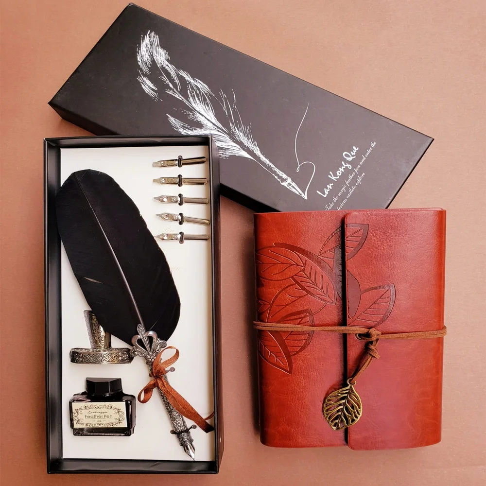 Kırmızı Deri Hatıra Defteri ve Tüylü Kalem Hediye Seti