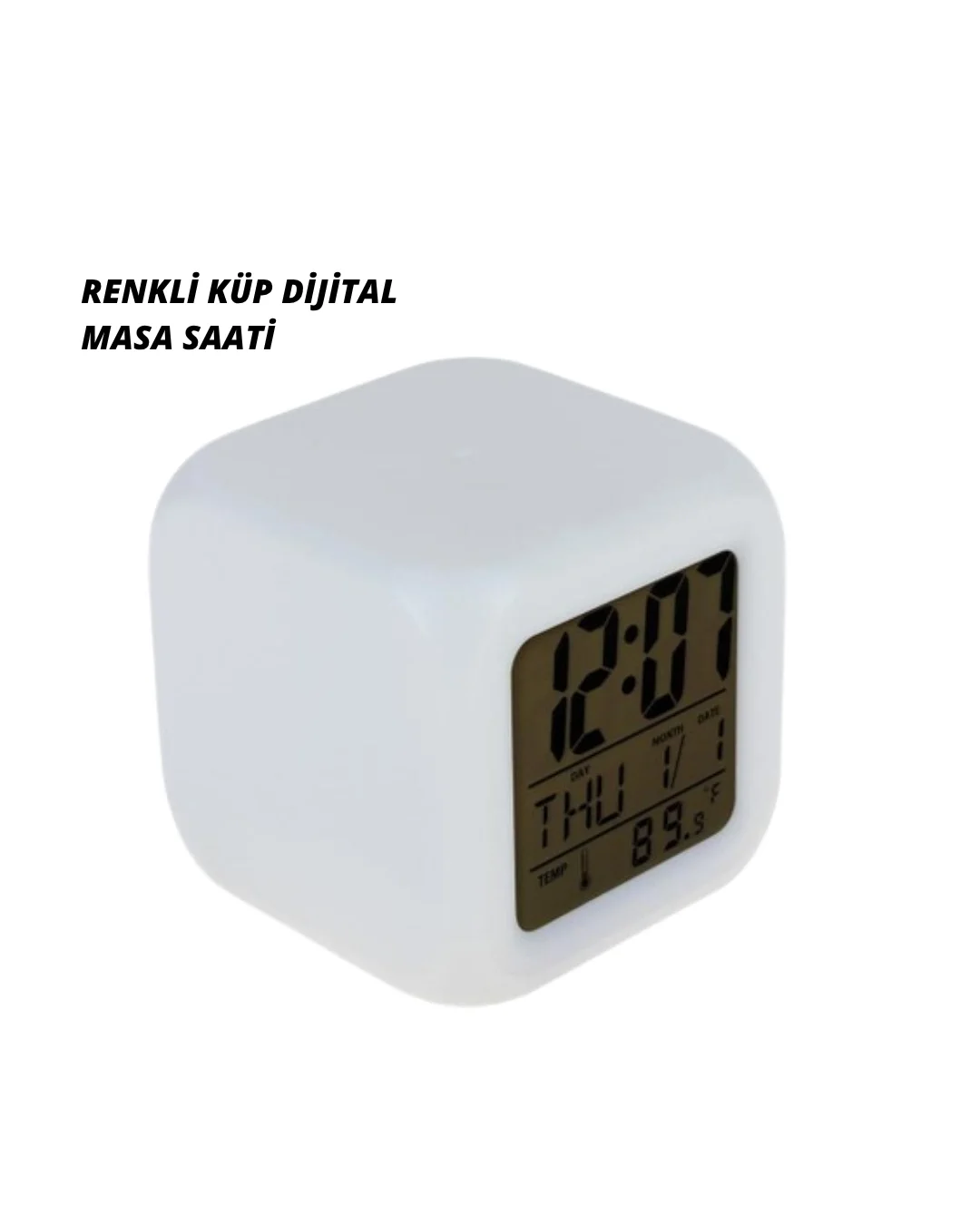 Bu renk değiştiren alarmlı dijital küp saat, çok yönlü özellikleri ve modern tasarımıyla dikkat çeker. 7 renk LED ışık modu, odanıza görsel bir şıklık kazandırırken, gece lambası olarak da kullanılabilir.Saatin işlevleri arasında alarm, müzikli uyarı, termometre, kronometre, takvim ve doğum günü hatırlatıcı bulunur. Özellikle müzikli alarm fonksiyonu klasik alarmlara kıyasla daha konforlu bir uyanış sağlar.8x8x8 cm ölçülerindeki kompakt tasarım, ürünü taşınabilir hale getirir. Yatak odasında, ofiste, çocuk odasında ya da seyahatlerde rahatlıkla kullanılabilir.Gece kullanımında oldukça işlevseldir. Saate dokunduğunuzda gövde ve ekran birlikte aydınlanır, 7 farklı renk arasında geçiş yapar. Dilerseniz sürekli renk değiştirme modunu da tercih edebilirsiniz.4 adet AAA ince kalem pil ile çalışır (piller dahil değildir). Pil ile çalışması, kablosuz kullanım kolaylığı sağlar.Modern kutu tasarımı sayesinde yalnızca işlevsel bir ürün değil, aynı zamanda sevdiklerinize sunabileceğiniz güzel bir hediye seçeneğidir.