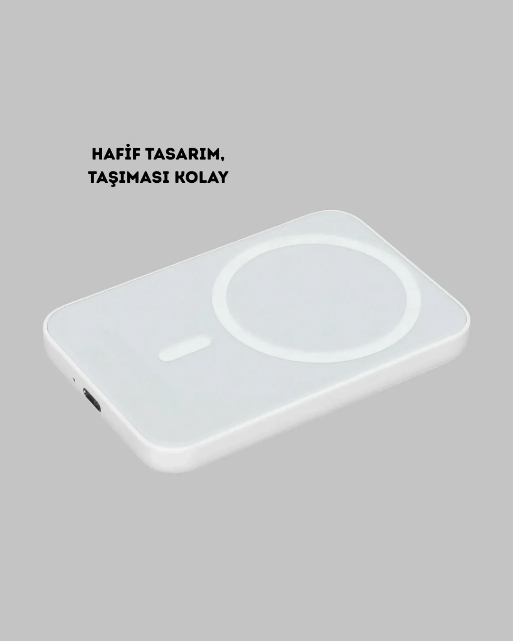 Bu manyetik kablosuz powerbank, kompakt ve ultra hafif yapısı sayesinde her yere kolayca taşınabilir. Cebinize veya çantanıza rahatlıkla sığar, telefonunuzu çizilmelere karşı korur. Minimalist tasarımıyla modern bir görünüm sunarken, günlük kullanım için mükemmel bir konfor sağlar.Kablosuz manyetik şarj özelliği sayesinde kablo karmaşasına son verir; telefonunuzu yalnızca arkasına yerleştirmeniz yeterlidir.
