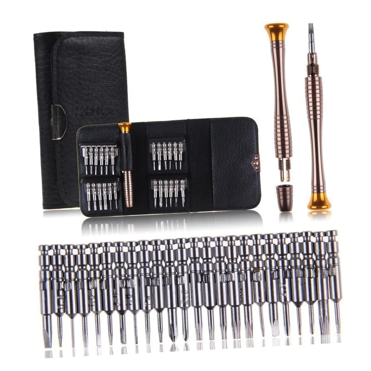MİNİ CÜZDAN TORNAVİDA SETİMini Cüzdan Tornavida Seti: Küçük, Pratik ve Güçlü!Mini Cüzdan Tornavida Seti, hassas elektronik cihazlar ve cep telefonları gibi küçük tamiratlar için ideal bir çözümdür. Set, 24 adet tornavida ucu ve 1 adet tornavida kaleminden oluşan toplam 25 parçadan oluşmaktadır. Kompakt boyutlarıyla (10.5 cm x 6.5 cm x 2 cm) her yere kolayca taşınabilir ve her zaman elinizin altında bulundurabilirsiniz.Dayanıklı çıtçıtı sayesinde cüzdan sağlam bir şekilde kapanır ve açılmaz. Tornavida uçları, cüzdanın içinde güvenli bir şekilde sabitlenmiştir ve yerinden çıkmaz. Sadece 112 gram ağırlığında olan bu set, hafifliği ve taşınabilirliği ile kullanım kolaylığı sunar.Mini Cüzdan Tornavida Seti, profesyonel kullanıcılar için geliştirilmiş olup, hassas elektronik ürünlerin ve cep telefonlarının tamiratında en iyi yardımcınız olacak şekilde tasarlanmıştır. Ergonomik tasarımı ve yüksek kaliteli malzemeleri ile uzun ömürlü kullanım sağlar. Kompakt ve pratik bu set ile her türlü tamirat işlemini kolaylıkla gerçekleştirebilirsiniz.Paket İçeriği1 adet mini cüzdan tornavida seti