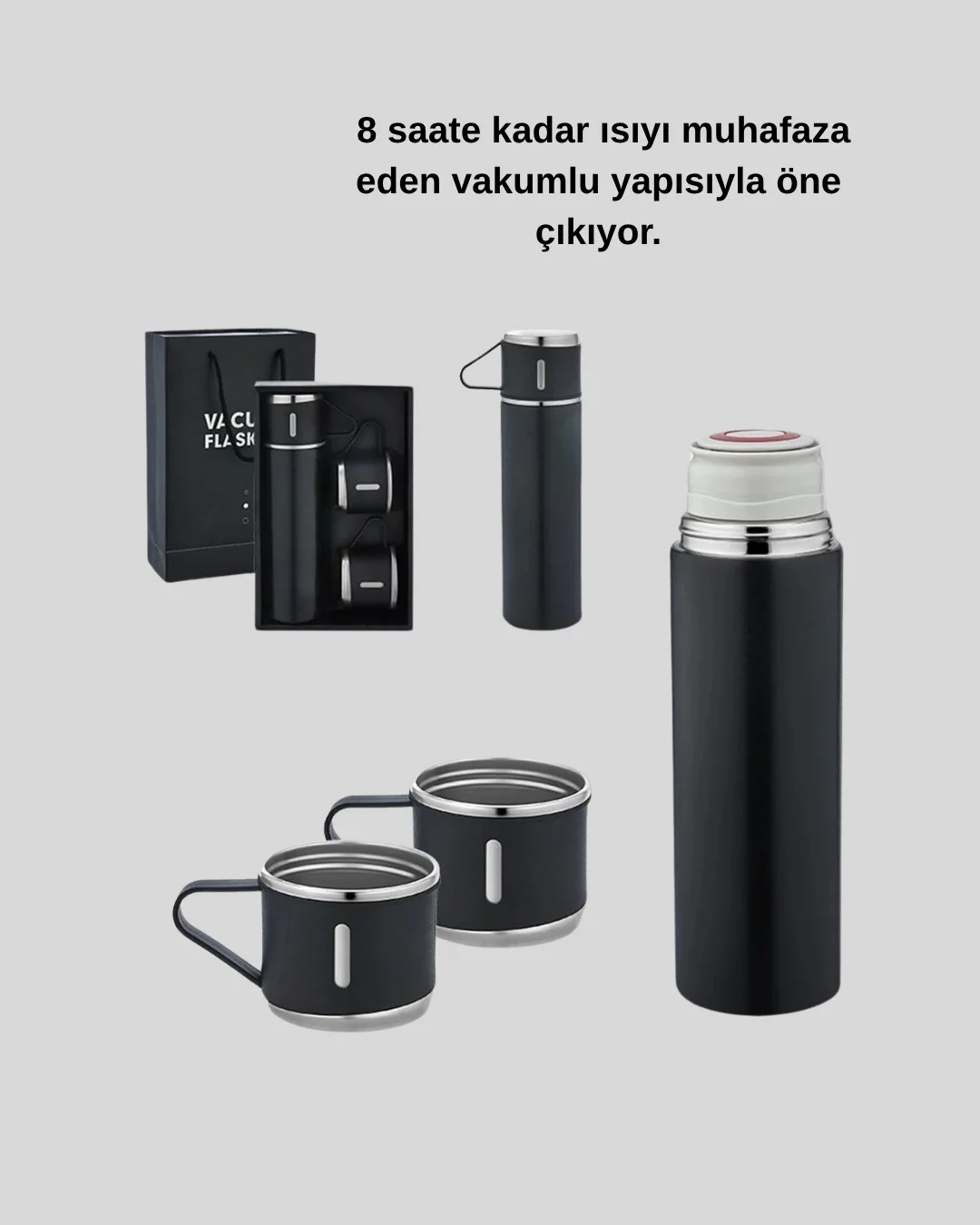 Günün her anında sıcak kahveniz veya soğuk içeceğiniz elinizin altında olsun! Paslanmaz Çelik 500 ml Termos Seti, dayanıklı malzemesi ve üstün yalıtım teknolojisiyle içeceklerinizi saatlerce ideal sıcaklıkta tutar.Çift katmanlı vakum yalıtımlı tasarım, iç sıcaklığın dış ortamdan etkilenmesini önleyerek hem sıcak hem de soğuk içeceklerin tazeliğini korur.8 saate kadar ısı muhafazası sunan bu termos, sabah doldurduğunuz kahvenin öğleden sonra bile sıcak kalmasını sağlar. Aynı zamanda buzlu içeceklerde de etkili yalıtım sunarak serinletici bir deneyim yaşatır.Sızdırmaz kapak sistemi, akıtma veya dökülme riskini ortadan kaldırır. Bu özellik sayesinde termosunuzu çantanızda, arabada veya spor çantanızda güvenle taşıyabilirsiniz. Basınçlı kapak mekanizması, tek elle kolay açılıp kapanabilir şekilde tasarlanmıştır.Ergonomik gövde yapısı, elde rahat tutuş sağlar. Şık, minimalist tasarımı hem kadınlar hem de erkekler için uygundur. Paslanmaz çelik iç yüzey, koku tutmaz ve içeceklerinizin lezzetini korur.Temizliği oldukça pratiktir; elde yıkama için uygundur ve düzenli temizlikle uzun yıllar ilk günkü performansını korur.İster ofiste, ister evde, ister seyahatte olun; bu termos seti sıcaklık konforunu her an yanınıza taşır!