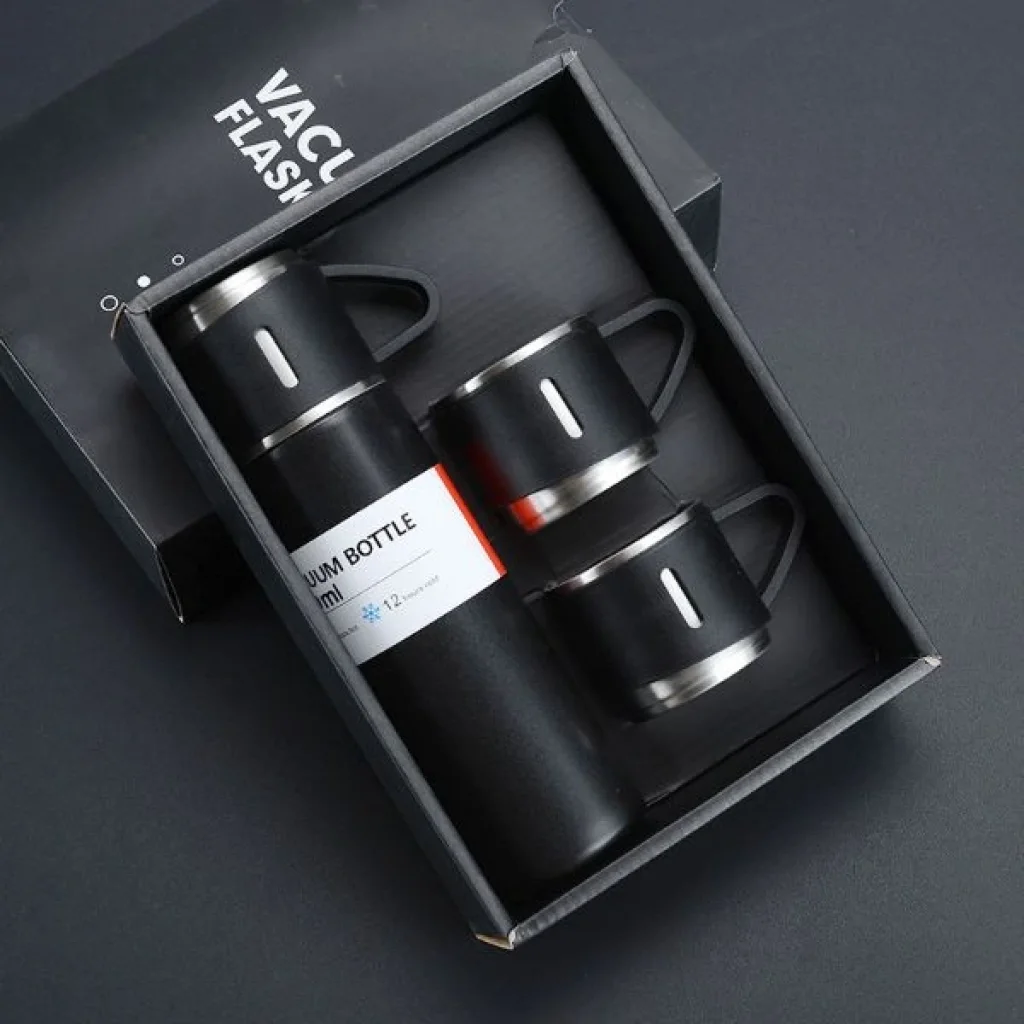 PASLANMAZ ÇELİK BARDAKLI TERMOS SETİ 500 ML.Ürün ÖzellikleriTutma kulp sayesinde kolayca taşınır.3 adet bardağı mevcuttur.2 katmanlı hassas teknoloji, ısı ve soğuk yalıtımlıdır. Kaydırmaz taban özelliği ile her zemine güçlü tutuş sağlar.12 saat sıcak ve soğuk tutma özelliğine sahiptir.500 ML kapasitesi mevcuttur.304 paslanmaz çelik kalitesi. Ürünün Ebatları:24 cm x 6,6 cm (bardak kulpu dahildir.) Paket İçeriği1 adet paslanmaz çelik bardaklı termos seti 500 ml.