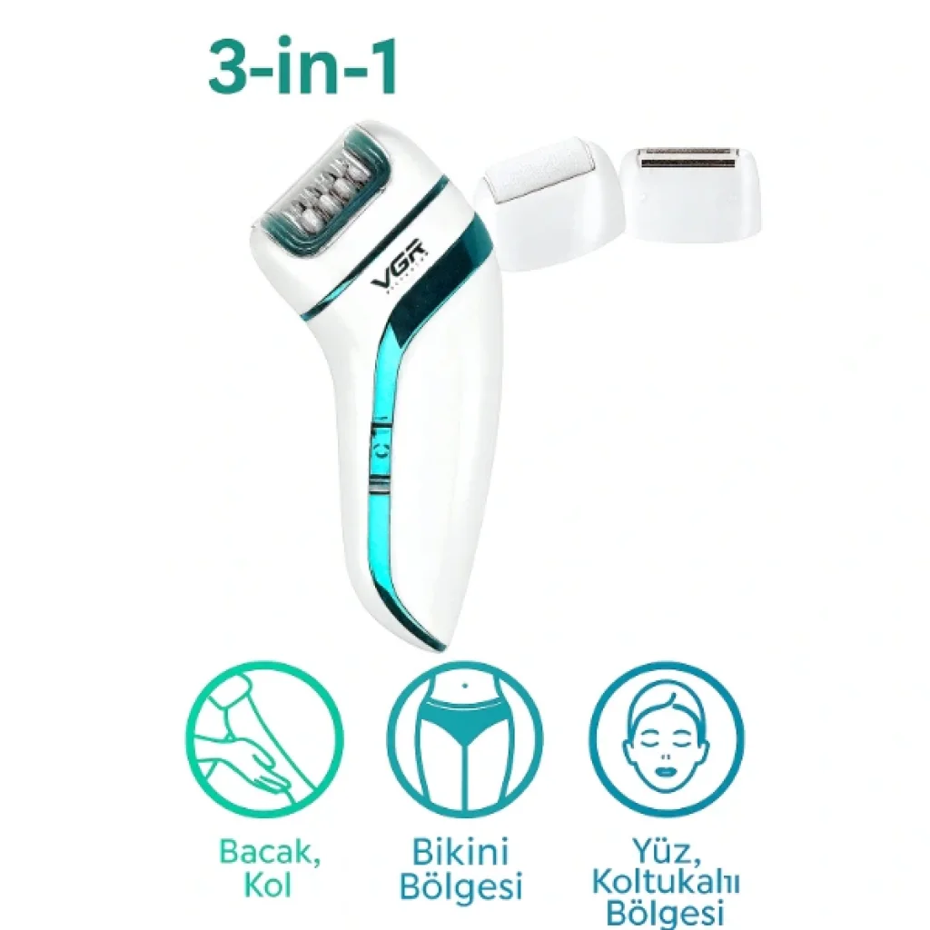 PROFESYONEL 3 BAŞLIKLI EPİLASYON ALETİÜrün ÖzellikleriProfesyonel 3 Başlıklı Epilasyon Aleti, farklı bölgeler için özel olarak tasarlanmış üç farklı başlığı sayesinde pratik ve etkili bir kullanım sunar. Yüz, bacak, koltuk altı, bikini bölgesi ve hassas bölgelerde kullanılabilir. Döner epilasyon başlığı istenmeyen tüyleri kökünden alarak pürüzsüz bir cilt sağlar. Tıraş başlığı hızlı ve kolay kullanım için idealdir, topuk törpü başlığı ise ayak bakımında etkili sonuç verir. Ergonomik tasarımı sayesinde elde rahat kavrama sağlar ve uzun süreli kullanımda bile konfor sunar. Şarjlı yapısıyla kablo karmaşası olmadan pratik kullanım imkânı sunar.Paket İçeriği1 adet Profesyonel 3 Başlıklı Epilasyon Aleti