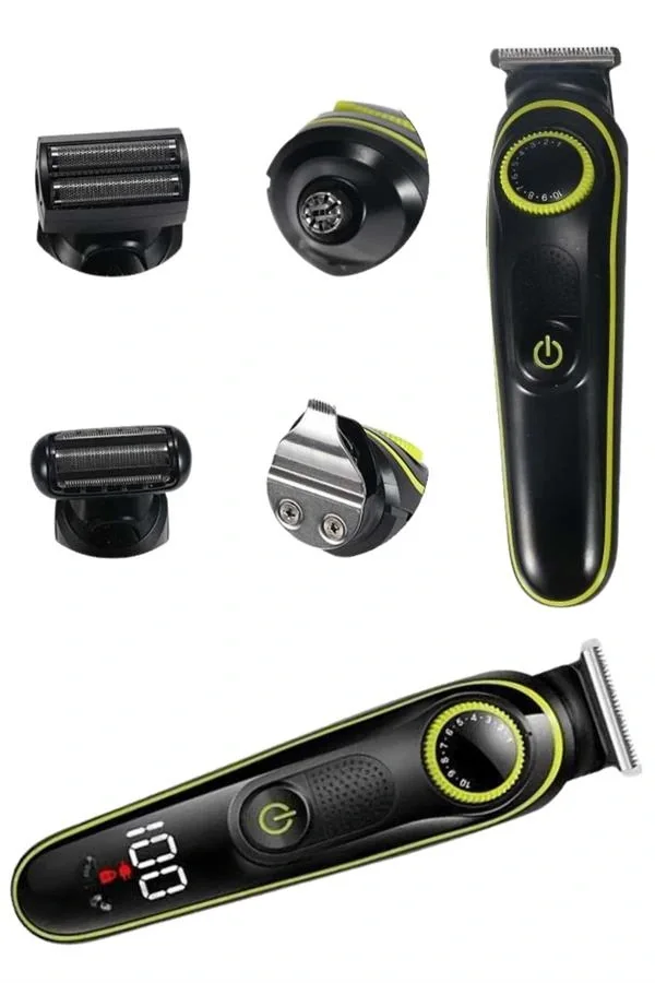 Bu 5'i 1 arada çok fonksiyonlu bakım seti, kişisel bakım rutininizi daha pratik ve etkili hale getiriyor. Saç kesimi, sakal tıraşı, burun ve kulak kılı temizliği, detaylı şekillendirme ve vücut tıraşı gibi birden fazla işlevi tek cihazda sunarak, tam kapsamlı bakım imkanı sağlıyor. Güçlü motoru ve paslanmaz çelik bıçakları ile pürüzsüz bir tıraş deneyimi sunarken, uzun ömürlü ve keskin yapısı sayesinde her kullanımda yüksek performans elde edebilirsiniz. Kablosuz ve şarjlı kullanımı sayesinde hareket özgürlüğü tanır; tam dolu batarya ile uzun süreli kullanım imkanı sunar. Farklı kesim uzunlukları için ayarlanabilir tarak başlıkları mevcuttur; bu sayede kişisel stilinize uygun şekillendirmeyi zahmetsizce gerçekleştirebilirsiniz. Ergonomik tutuşa sahip şık ve modern tasarımı, hem kullanım kolaylığı sağlar hem de banyo alanınıza estetik bir katkı sunar. Üzerindeki LED gösterge, pil seviyesini anlık olarak takip etmenize olanak tanırken, düşük sesli çalışması ile her ortamda konforlu bir kullanım deneyimi yaşatır. Suya dayanıklı başlıkları ve çıkarılabilir bıçakları sayesinde temizlik işlemleri oldukça kolaydır; hijyenik kullanım için yalnızca düzenli olarak yıkamanız yeterlidir.