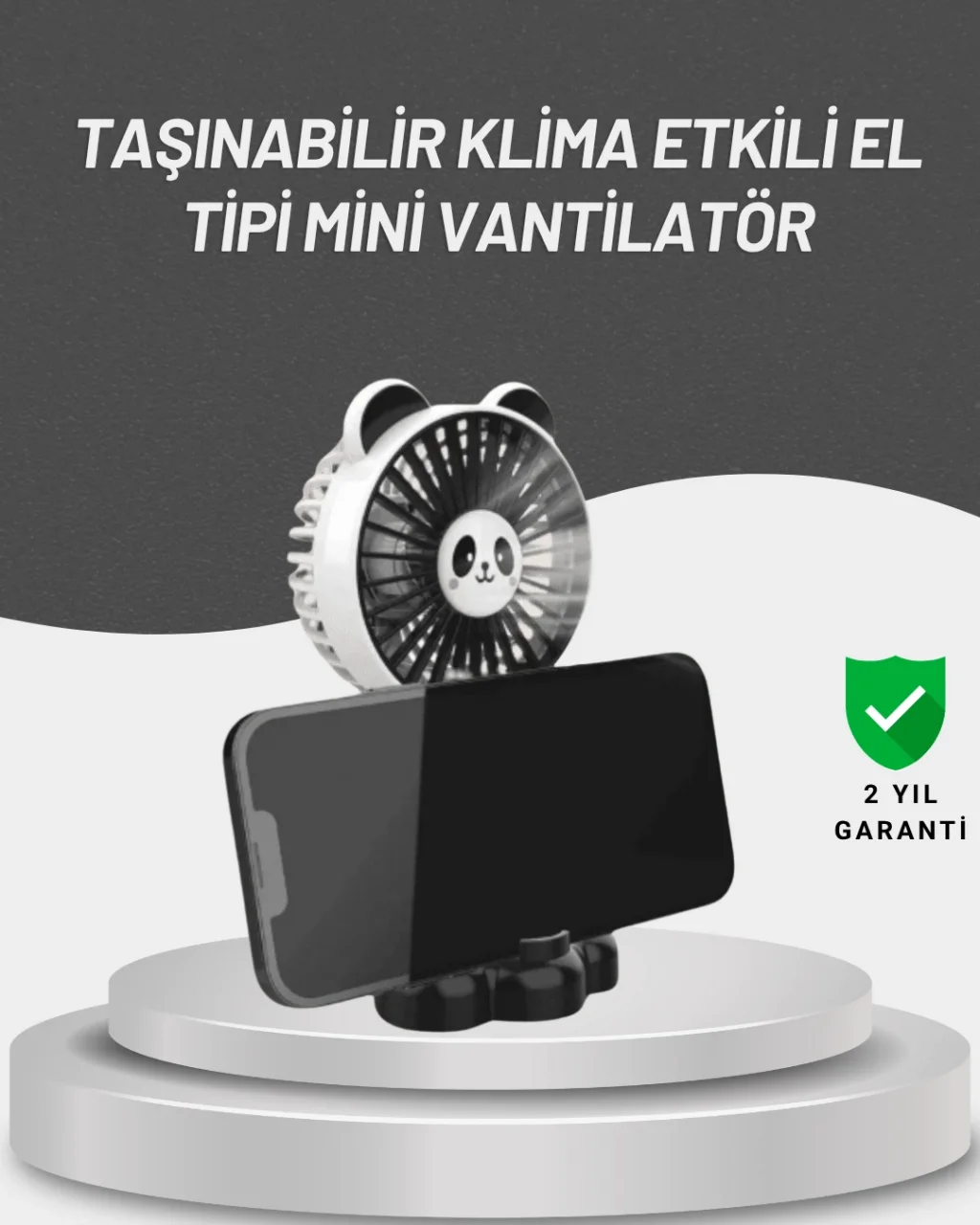 Taşınabilir yapısı ve sevimli panda desenli dış yüzeyi ile dikkat çeken mini vantilatör, sıcak havalarda ferahlamak isteyen kullanıcılar için pratik bir çözümdür. Güçlü motoru sayesinde küçük boyutuna rağmen oldukça etkili bir hava akımı üretir.USB kablosu sayesinde her ortamda şarj edilebilir. Powerbank, dizüstü bilgisayar ya da priz adaptörü ile şarj etmek mümkündür. Kablosuz kullanım esnasında da performansından ödün vermez. Şarj süresi kısa, kullanım süresi ise tatmin edicidir.Kompakt ve hafif yapısı, ürünü dış mekan kullanımı için ideal hale getirir. Piknikte, yürüyüşte, toplu taşımada ya da tatilde kullanabilirsiniz. Aynı zamanda masaüstü kullanıma da uygundur. Panda temalı tasarımıyla masa dekorasyonunuza renk katar.