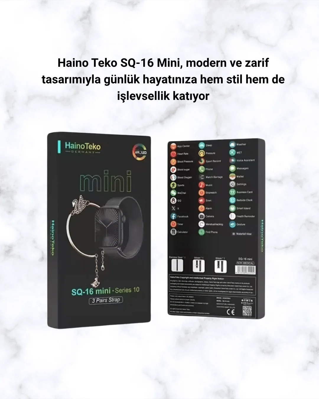 SQ-16 Mini Series 10 akıllı saat, şık tasarımı ve gelişmiş özellikleriyle öne çıkıyor. Hafif ve kompakt yapısı sayesinde her bileğe kolayca uyum sağlar. 3 farklı kordon (silikon, metal ve deri) ile tarzınıza uygun kombinler oluşturabilir, hediye bileklik ile görünümünüzü tamamlayabilirsiniz. Tüm telefonlarla uyumlu yapısıyla günlük kullanım için idealdir.