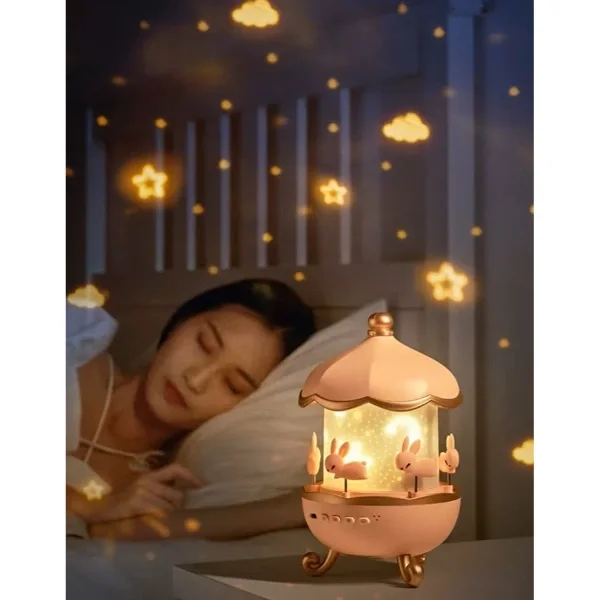 TAVŞAN ATLIKARINCA MULTİFONKSİYON PROJEKTÖRÜrün ÖzellikleriTavşan Atlıkarınca Multifonksiyon Projektör, müzik kutusu olarak da çalışabilen ve mobil cihazlar ile Bluetooth üzerinden müzik çalabilen bir üründür. Üst kısmındaki ve içteki tavşan figürleri döner, geceyi daha eğlenceli hale getirir. Cihaz, farklı ışık seviyeleri sunarak loş, orta ve güçlü aydınlatma seçenekleriyle ortamın aydınlatmasını değiştirir. Sıcak ışık, nötr ışık ve renkli ışık seçenekleriyle atmosferin tarzını değiştirebilirsiniz. Gökyüzü desenleri ve sevimli desenler içeren 12 farklı projeksiyon film diski sayesinde duvar ve tavana yıldızlar veya çeşitli desenler yansıtılabilir. USB ile şarj edilebilen bu projektör, bebek/çocuk odalarında kullanılabileceği gibi, gece lambası, uyku yardımcısı ya da hediye olarak da tercih edilebilir.Paket İçeriği1 Adet Tavşan Atlıkarınca Multifonksiyon Projektör