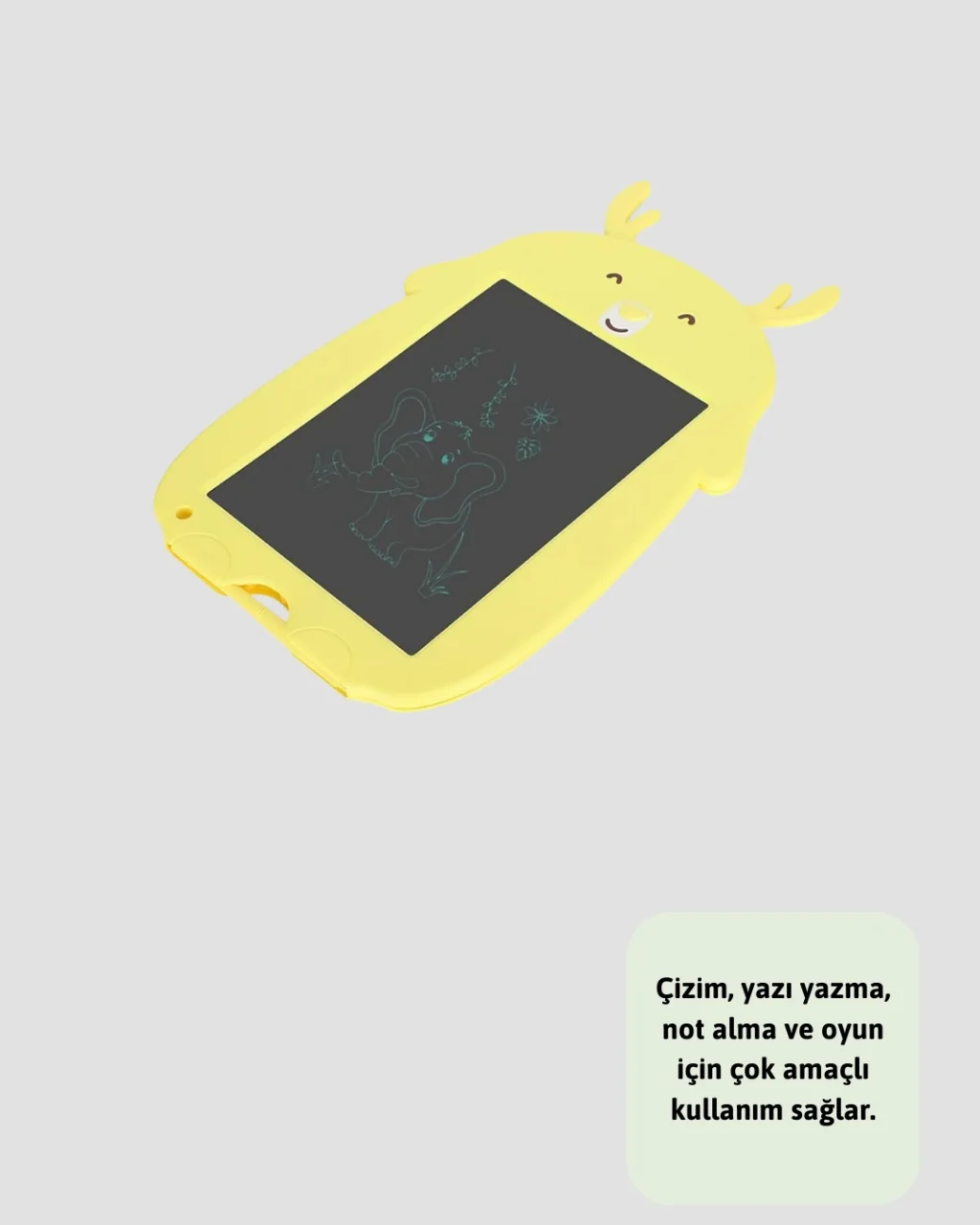 Kağıt benzeri LCD yazı tableti, hem çocuklar hem de yetişkinler için çevre dostu, pratik ve eğlenceli bir yazı çözümüdür. Gerçek kağıt hissi veren esnek ekranı sayesinde göz yorgunluğunu önler. Çocuklar bu tabletle resim yapabilir, yazı yazabilir ve yaratıcılıklarını geliştirebilir. Tek tuşla silme özelliği, silgiye gerek kalmadan anında temizleme imkânı sunar. Kilit işlevi, yapılan çizimlerin korunmasını sağlayarak yanlışlıkla silinmesini engeller. LCD ekranın yüksek kontrastlı yapısı, el yazısını ve çizimleri netleştirir. Uzun ömürlü düğme pili düşük enerji tüketimi sayesinde bir yıl boyunca kullanım sağlar. Çevre dostu yapısı ile kağıt kullanımını azaltır. Hafif ve kompakt yapısı sayesinde okulda, evde, seyahatlerde kolaylıkla taşınabilir. Çocukların eğitici bir oyuncağı, yetişkinlerin ise pratik bir not defteri veya mesaj panosu olabilir. Eğlenceli tavşan figürlü tasarımı sayesinde çocukların ilgisini çeker. Günlük yaşamda eğlence, eğitim ve işlevselliği bir arada sunan bu LCD yazı tableti, uzun ömürlü kullanımıyla vazgeçilmez bir yardımcıdır. Hem çevreyi koruyan hem de yaratıcılığı destekleyen ideal bir üründür.