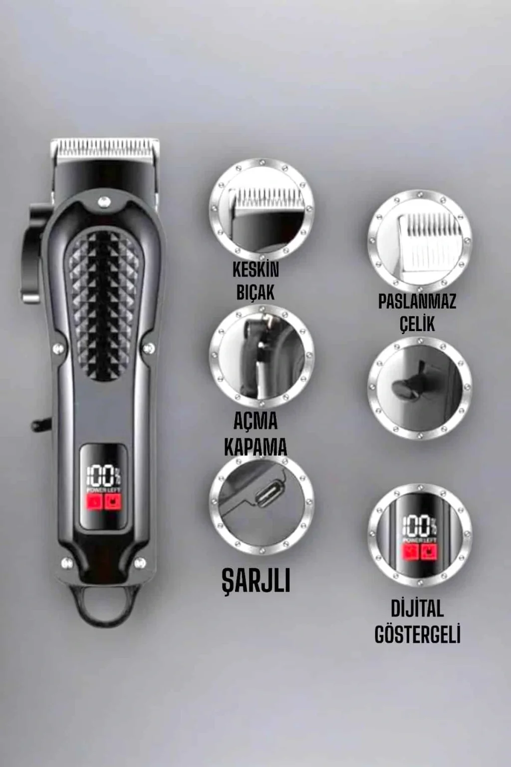Bu tıraş makinesi, saç ve sakal bakımını yeni bir seviyeye taşıyor. Keskin ve dayanıklı bıçakları sayesinde saç ve sakal kesiminde üstün hassasiyet sunar. Her tip tüy ve kıl için uygun olan bu cihaz, farklı uzunluklarda kesim yapmak isteyen kullanıcılar için değiştirilebilir tarak başlıkları ile donatılmıştır. Şarj edilebilir güçlü bataryası, tam şarj ile uzun süre kesintisiz kullanım sağlar. Ergonomik tasarımı, cihazı kolayca kavramanızı ve en zor alanlarda bile rahat bir şekilde manevra yapmanızı sağlar. Sessiz çalışan motoru, konforlu bir tıraş deneyimi yaşatırken, çıkarılabilir ve yıkanabilir bıçakları hijyenik bir kullanım sunar. Bu çok yönlü tıraş makinesi, hem profesyonel hem de ev kullanımı için idealdir ve her kullanıcının beklentisini karşılayacak şekilde tasarlanmıştır.