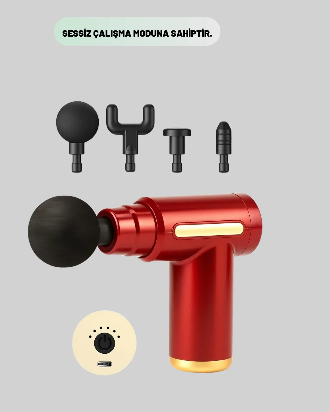 Titreşimli masaj tabancası, kas yorgunluğunu azaltmak ve vücudun farklı bölgelerinde etkili rahatlama sağlamak amacıyla tasarlanmıştır. Bacak, kol, sırt, boyun ve omuz gibi bölgelerde kullanıma uygun yapısı sayesinde hem günlük kullanım hem de spor sonrası rahatlama için ideal bir çözümdür. Ergonomik tasarımı sayesinde elde rahatça kavranır ve uzun süreli kullanımda konfor sunar.Cihaz, 6 farklı hız ayarı ile kişisel ihtiyaca göre ayarlanabilir bir masaj deneyimi sunar. Düşük hızlar hafif gevşeme sağlarken, yüksek hızlar daha yoğun ve derin bir masaj hissi oluşturur. Sessiz çalışma modu sayesinde evde, spor salonunda veya dinlenme alanlarında çevreyi rahatsız etmeden kullanılabilir.4 farklı masaj başlığı ile çok yönlü kullanım imkânı sunar. Yuvarlak başlık geniş kas gruplarına genel masaj yaparken, U başlık omurga çevresi için uygundur. Düz başlık büyük kas gruplarında rahatlama sağlarken, nokta başlık derin doku masajı için kullanılır. Bu sayede her bölgeye uygun masaj uygulaması yapılabilir.Şarj edilebilir pil yapısı, kabloya bağlı kalmadan özgür kullanım sağlar. Taşınabilir ve hafif yapısı sayesinde evde, spor salonunda veya seyahatlerde rahatlıkla kullanılabilir. Düzenli kullanımda kas sertliğinin azalmasına, kan dolaşımının desteklenmesine ve spor sonrası toparlanma sürecinin hızlanmasına katkı sağlar. Titreşimli masaj tabancası, kas sağlığını destekleyen pratik ve etkili bir yardımcıdır.