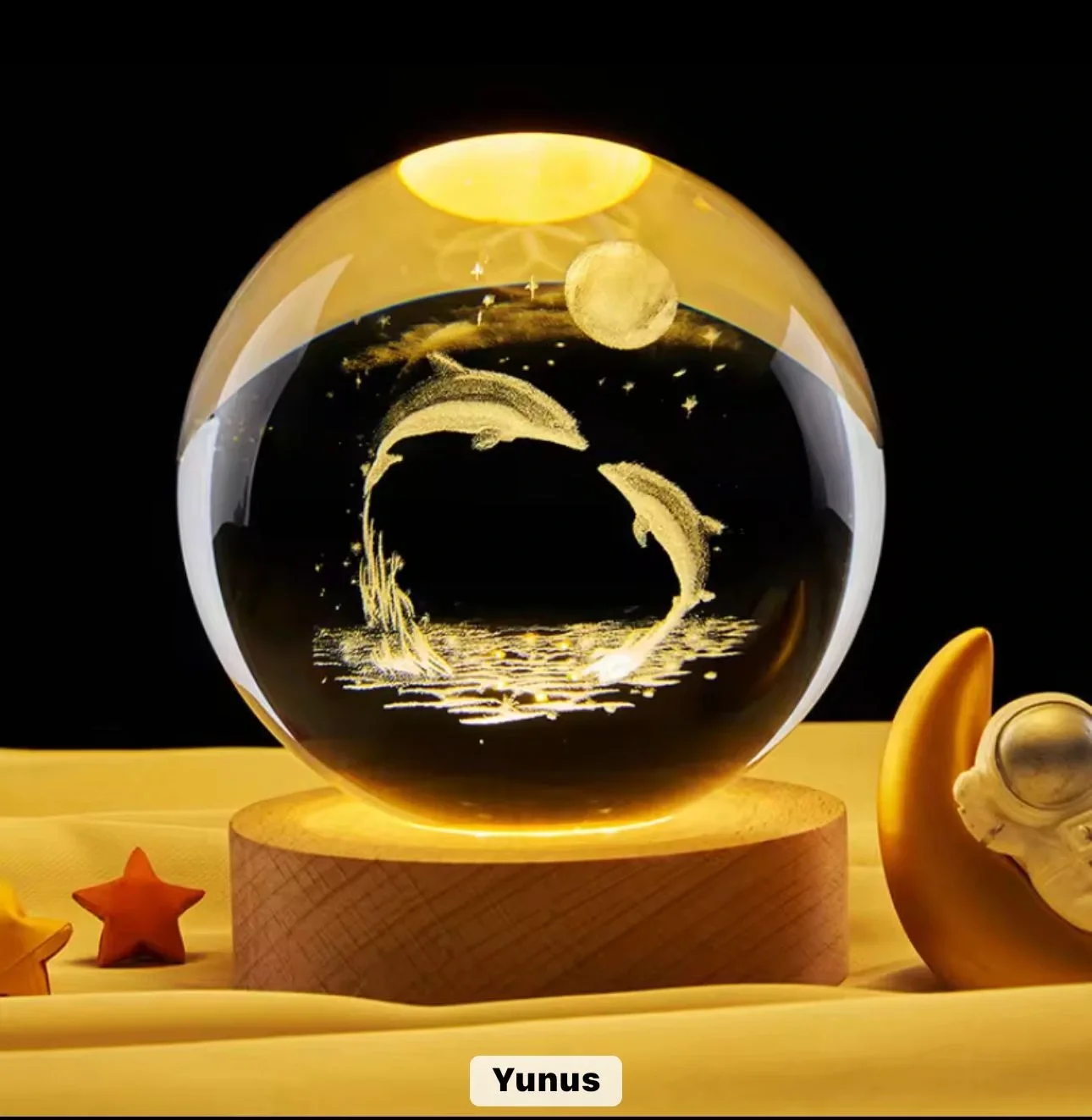 Kristal yüzeyin parlaklığı ve içindeki lazer oyma yunus deseni üstün işçilikle hazırlanmıştır. Ahşap taban, doğal dokusuyla ürünü hem dayanıklı hem de estetik hale getirir. Işık açıkken büyüleyici, ışık kapalıyken bile zarif bir dekoratif obje olarak kullanılabilir. Uzun ömürlü LED ışığıyla kaliteli bir kullanım deneyimi sunar.